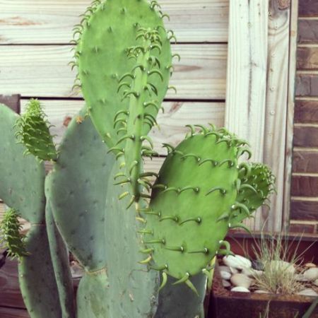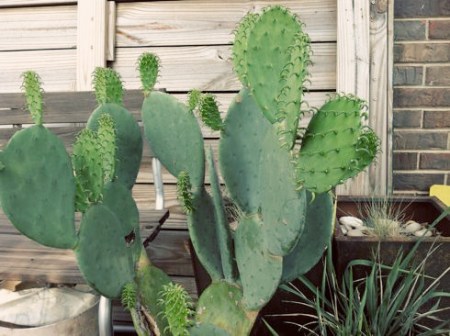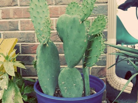 Jason did bring quite a few plants over to our temporary home at my parents’ in pots. Recently the spineless prickly pear has been having it’s spring grow spurt. I love this thing. It’s so fun! It grows these soft, thick “spines” that dry up and fall off, leaving a polka-dotted paddle. The spineless prickly pear in front of our old house was (and still is) getting huge. We hope to grow these salvaged babies big in front of our new house, too.