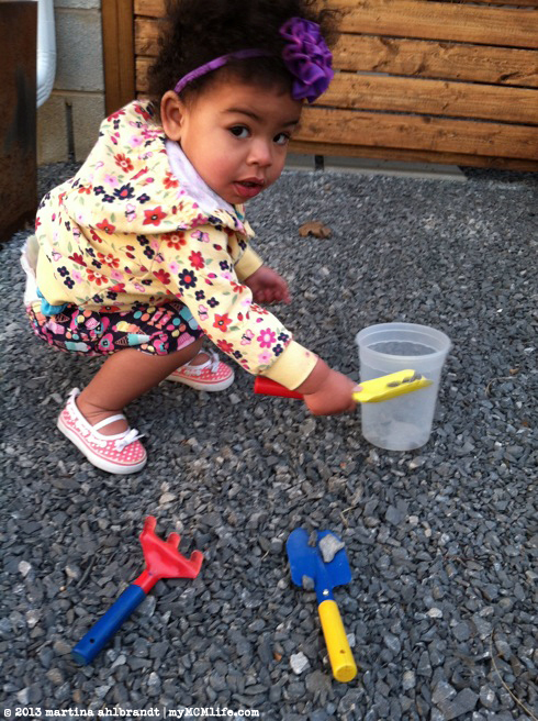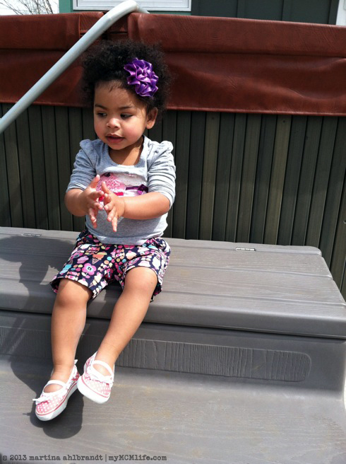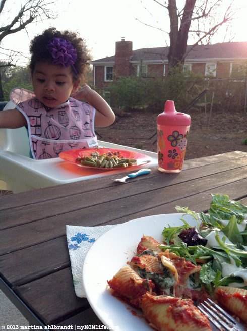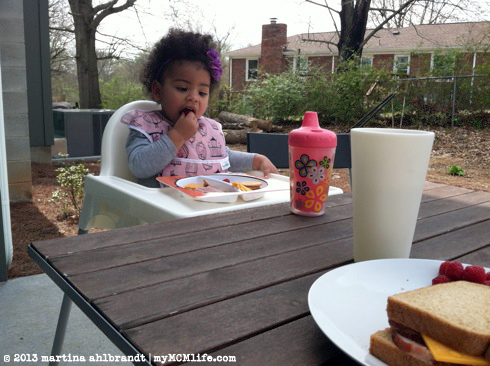 As soon as it was warm though, I enthusiastically moved Ali’s high chair outside. Food throwing is one of my biggest pet peeves with her lately. (The other is splashing in the bath tub and soaking the mama, in case you were wondering.) Eating outside provided a temporary reprieve. I didn’t change the rules but it allowed me to stay more relaxed while correcting her, rather than getting stressed out about a strawberry smacking the white wall or a green bean getting smashed onto the wood floors. And getting stressed out makes me more likely to lose my temper with my sweet little girl. I’m a work in progress, as is she.