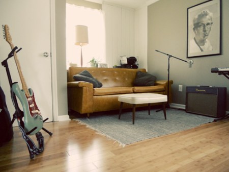 It’s amazing how much bigger this space feels now that it’s cut in half. Even the main space feels bigger than the old space. Jason took out of the closets which allowed us to fit that giant couch perfectly into that nook. The space behind it is half the impractically high window seat and half a ledge that will eventually be shelves on top. The smaller room, “the loud room”, will be used for storage and tracking. It’s still needing insulation, sound absorption and drywall; shelves; lighting; rug; etc.