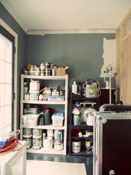 The purpose of the second smaller room was originally for recording purposes but has also become a useful storage space for tools, paint, unused equipment and empty cases. And other random stuff. Yes, this room is certainly not done (nor is the doorway leading to it from the main studio room). But, here you go.