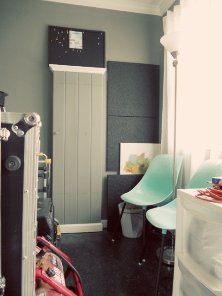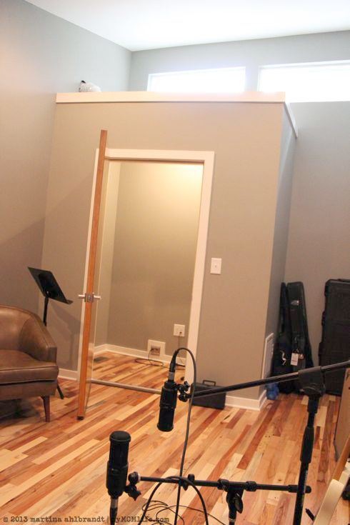 This closet is actually a recording booth with an angled wall. It has it’s own air intake, fan, light and solid door. The ceiling in this room is also sloped/vaulted like most of the other rooms in our house. All of those angles have something to do with listening to and/or recording music. Jason’s considering putting a cushion above the recording booth and making a little loft hangout.