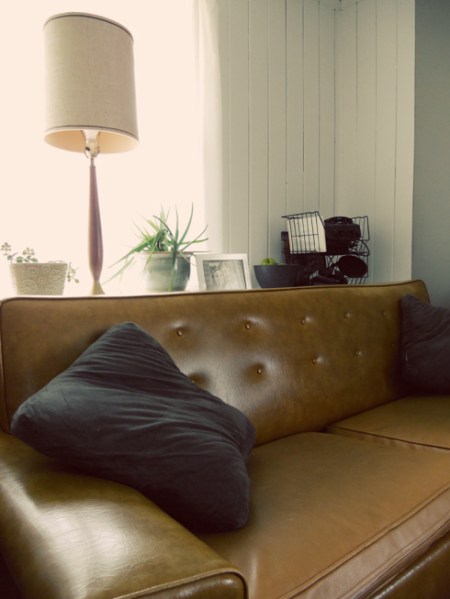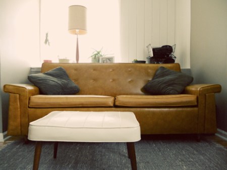We got this vinyl (naugahyde) sofa at an estate sale. It’s a miracle Jason and I didn’t get hernias moving it. It weights a ton. Or close to it. The footstool is from craigslist.