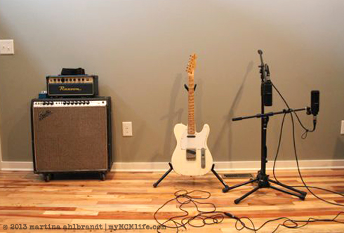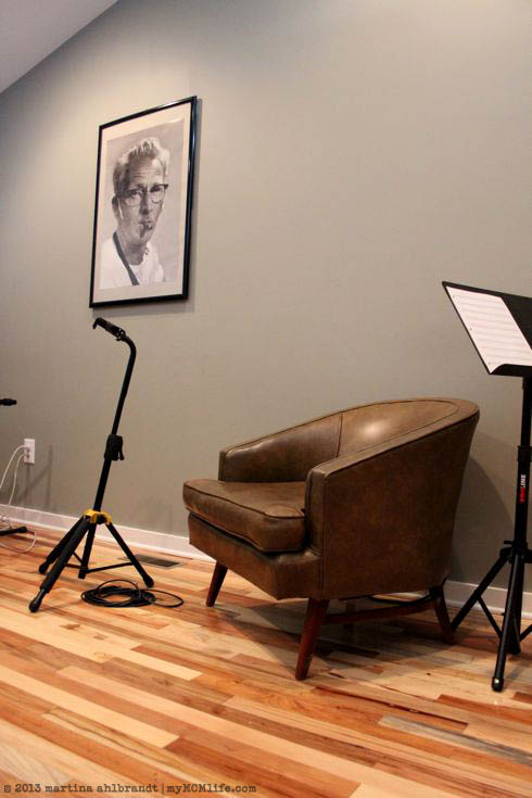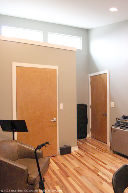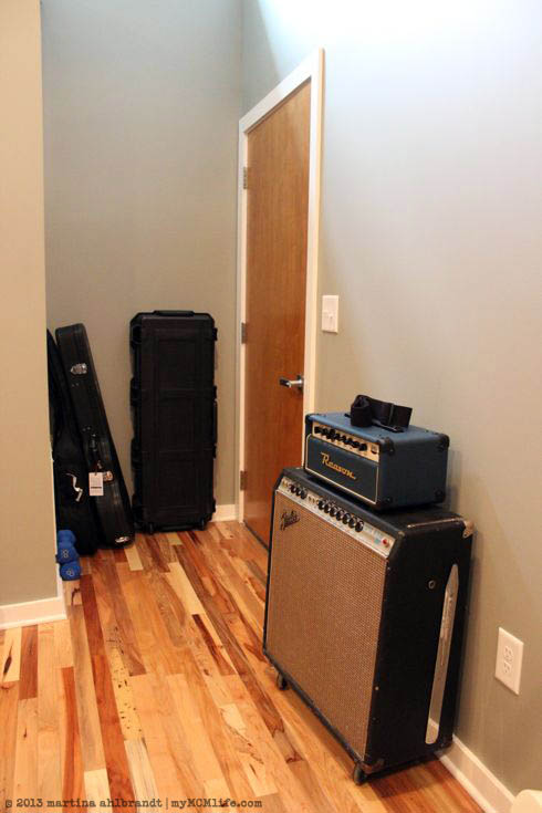 Jason’s music studio is located just beyond the living room and dining room. It was once a den with wood paneled walls but was listed as a bedroom when we bought our house. It’s gone through a lot of changes since then. The floors have been carpeting, painted (unsalvageable) wood floors, black VCT tiles, and most recently bamboo flooring. Last year we removed 1 of 2 closets and added a wall to create 2 different rooms. (You can read about it and see before pictures here.) There is now a main studio control room and a second utility room (sometimes called the mudroom, storage room, “loud room,” or auxiliary room.)