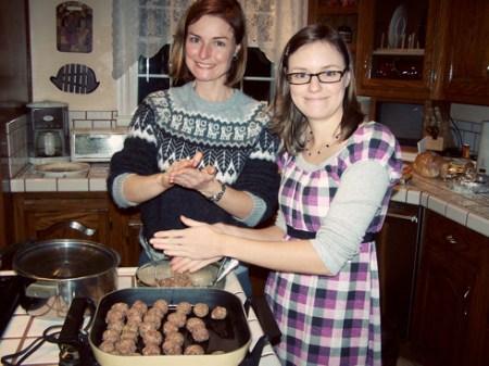 My sister and I rolling the traditional Swedish meatballs on Christmas Eve