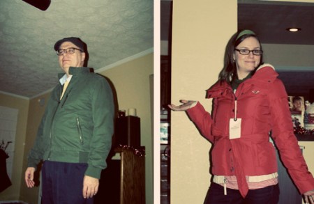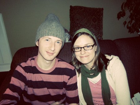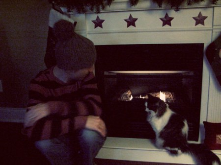 Chloe and Jason staying warm by the fireplace
