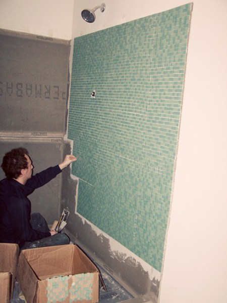 … And making sure they’re all straight and flush. But it’s going to be SOOOOO worth it! I can’t wait to see how it’ll look when the whole shower is done.