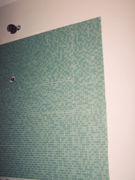 We’ve got a good system going now where I pop half the tiles off of each sheet in a random pattern at about the same pace as Jason can stick them up on the wall. If I crop out the unfinished parts and you use your imagination with the grout (we’re thinking gray) this picture gives a pretty good idea of the finished look:
