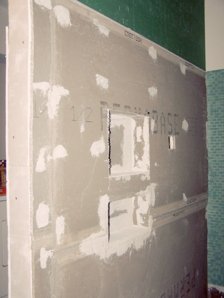 We designed built-in shelves into one side of the shower wall. In order to finish them with cement board so we can tile, we had to put drywall up on the laundry room side.